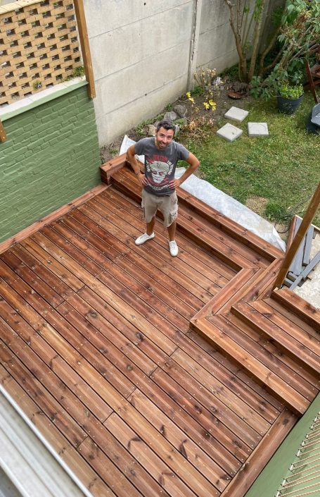 Véritable pièce supplémentaire, la terrasse peut totalement changer votre bien-être dans votre espace extérieur. Ici, un pin Douglas traité, soutenu par un vert kaki, permettent une intégration douce dans le jardin.